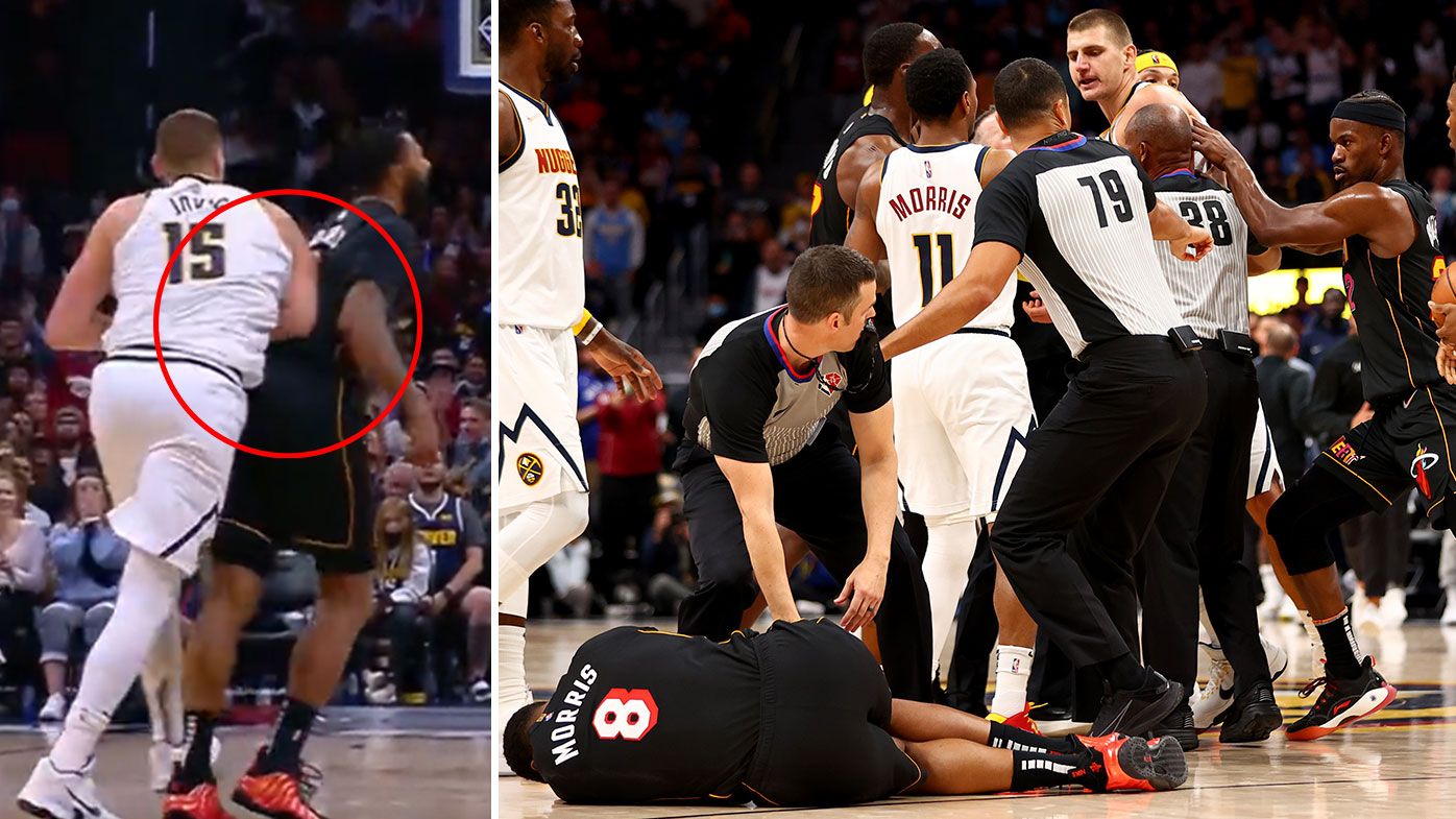 Tensions flared but after things calmed down and after the review both players were sent off. Mondays game between the Miami Heat and the Denver Nuggets turned ugly late in. By bringing the ball back to the ground Nikola Jokic was the victim of a serious foul by Markieff Morris which triggered a rather physical reaction from the Serbian center. Nikola Jokic ejected after altercation with Markieff Morris who suffers apparent neck injury.